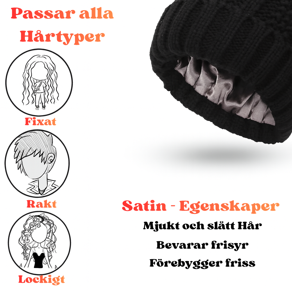 Upplev perfekt kombination av stil och komfort med vår eleganta Satinmössa för alla kalla väder. Glansigt satintyg som ger ett exklusivt uttryck samtidigt som den är skonsam mot håret. Den mjuka insidan minskar friktion, motverkar friss och bevarar hårets naturliga fukt - Även när du är på språng.